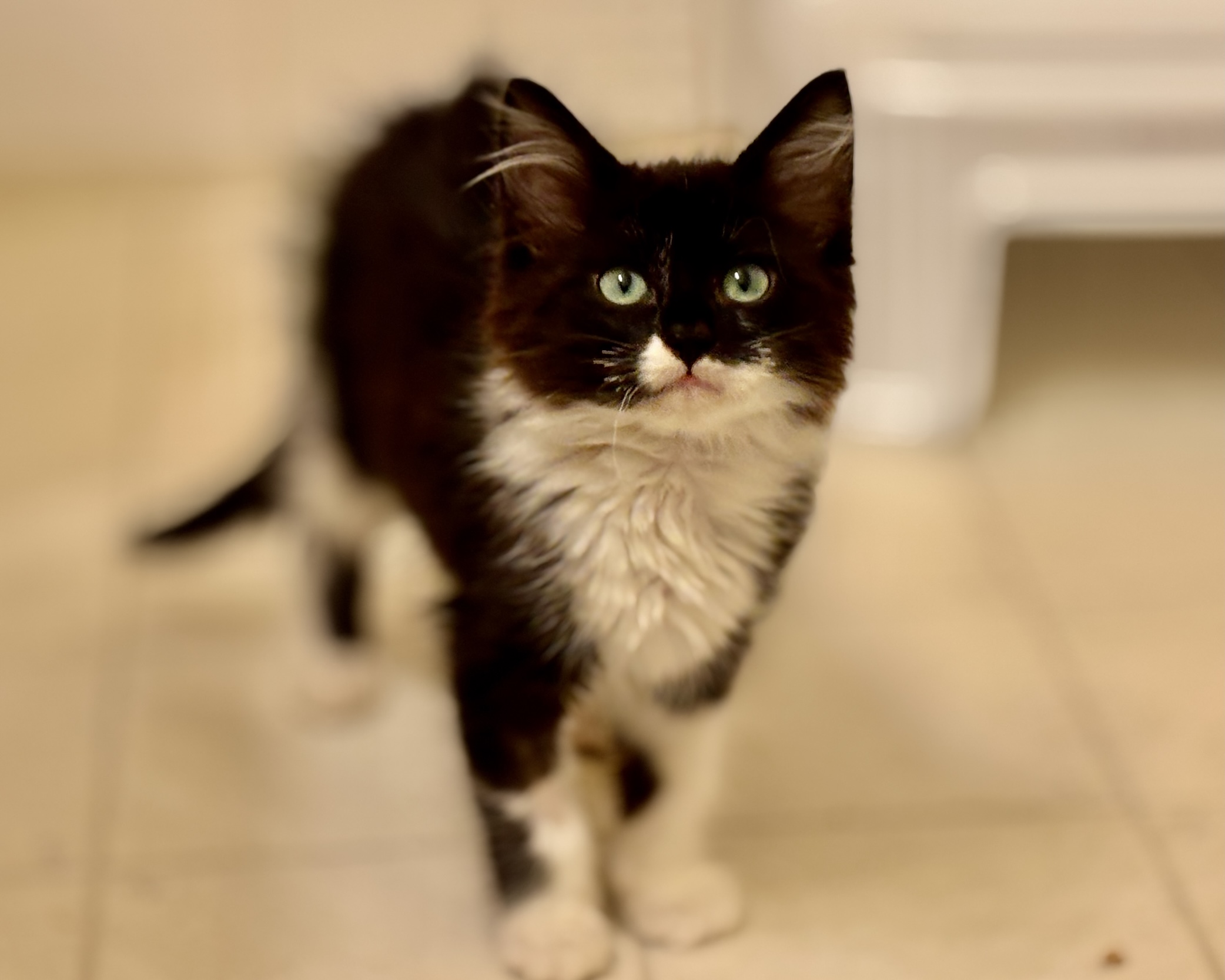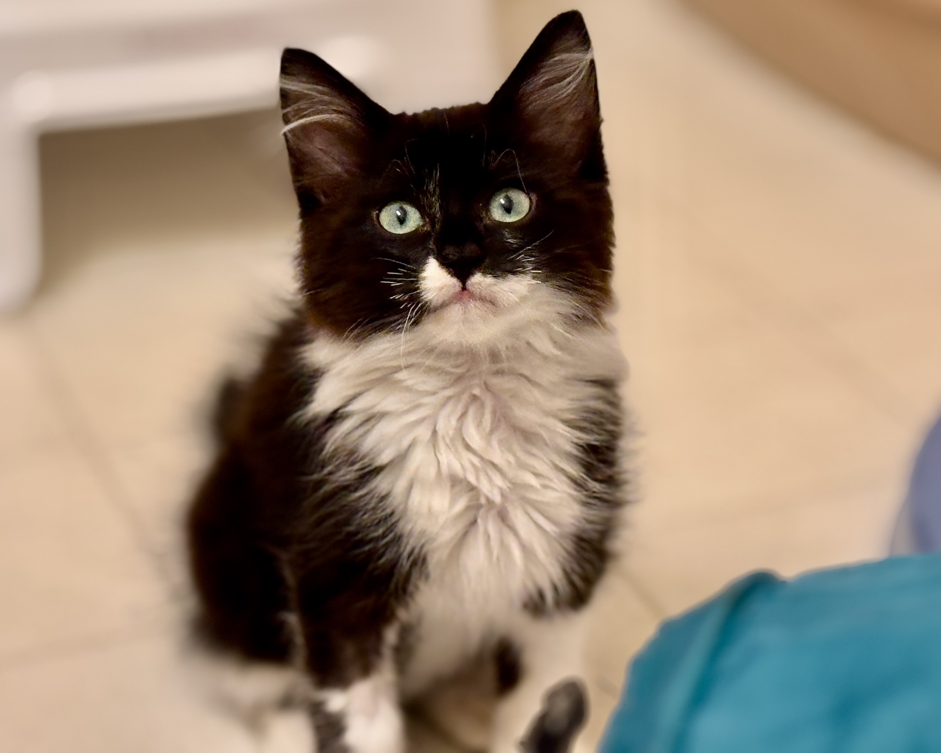 Estimated to be 9 weeks old when found, they immediately played with wands, ate churro treats from a hand, and ate food in front of people. This was not typical behaviour of feral-born kittens of this age.